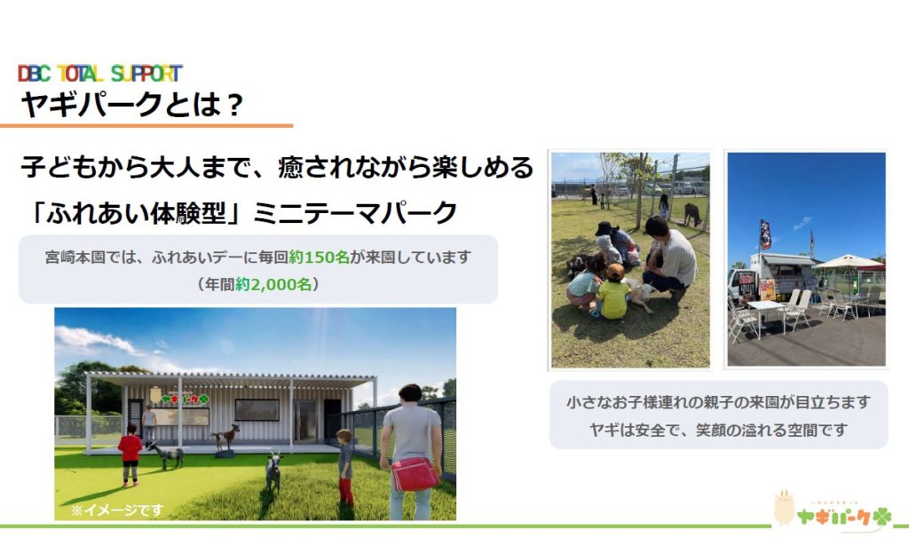 ヤギおじさんが手がけるヤギパークは、子どもから大人まで、誰もが癒されながら楽しめる「ふれあい体験型」のミニテーマパークです。宮崎本園では、ふれあいデーに毎回約150名、年間約2,000名もの方々が来園されており、特に小さなお子様連れの親子の来園が目立ちます。